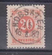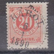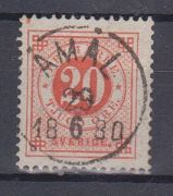 F46 20 öre ringtyp stpl.Stockholm 28-7-1887 ovanl.variant del av tryck saknas. Kv ?