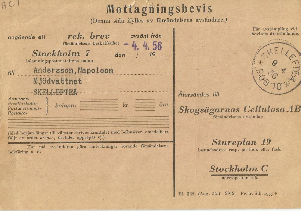 Skellefteå POB 10, Mjödvattnet på Mottagningsbevis 1956