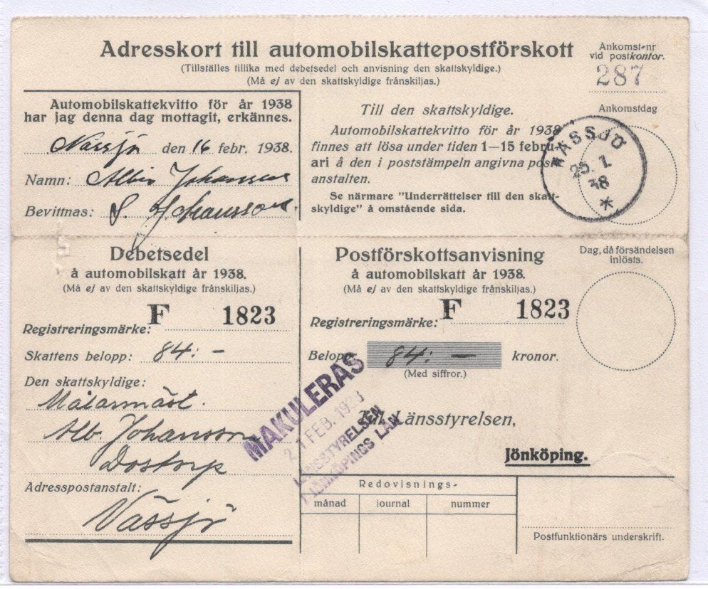 F/SM Adresskort för bilskatt NÄSSJÖ 1938-01-25