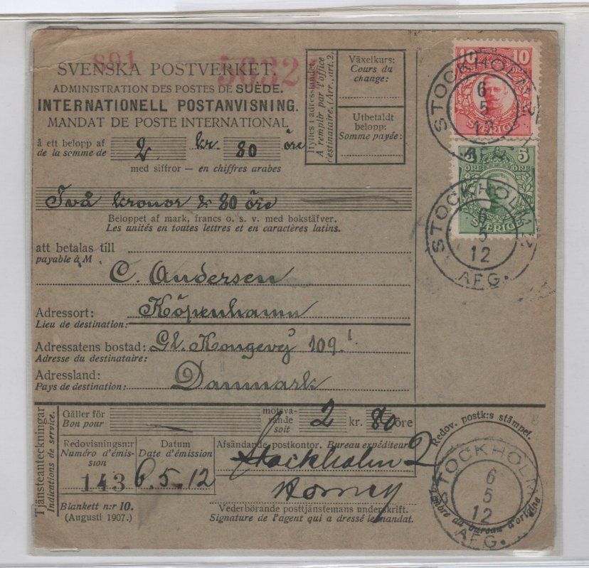 Internationell postanvisn fr Sverige till Danmark F79+82 Vackert ex