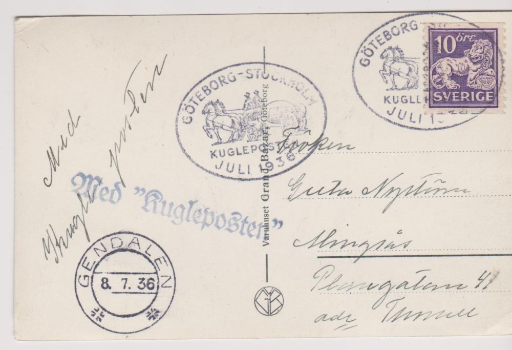 Göteborg. Konserthuset. Kugelposten juli 1936 stämplad Grendalen 8.7.36 |