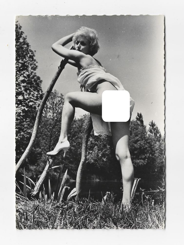 Mycket fint vintage fotovykort med delvis naken tjej/kvinna. Naturligtvis ingen vit censur på originalet, endast här. Fotovykort är här definition för ett taget foto som är tryckt på kartongpapper som är i tjocklek som ett vykortstjocklek. Ett framkallat fotografi på fotopapper är mycket tunnare. Ca 60-tal om man ska gå på detaljer och klädseln i fotot. Obs Ej offset tryckt.Storlek 15 x 10,5 cm.