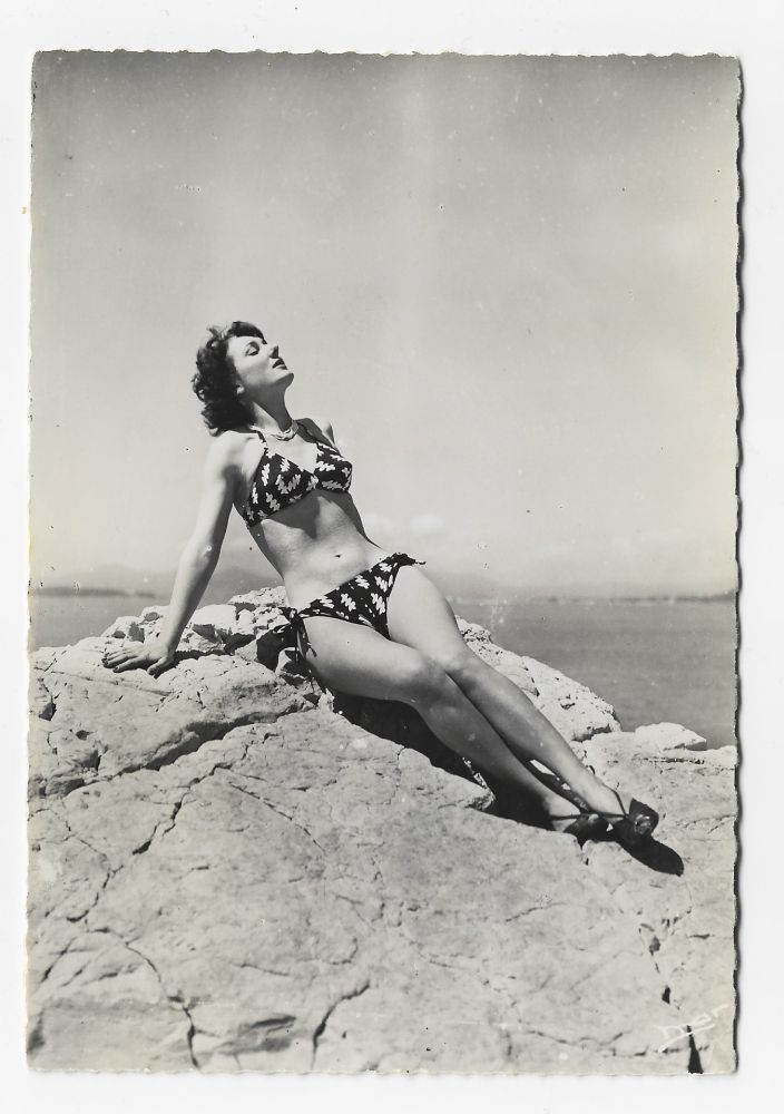 Mycket fint vykort med tjej / kvinna i bikini. Troligen 60-tals mode.Topp kvalité = se bilder. Storlek ca 15 x 10 cm (normal vykortsstorlek).