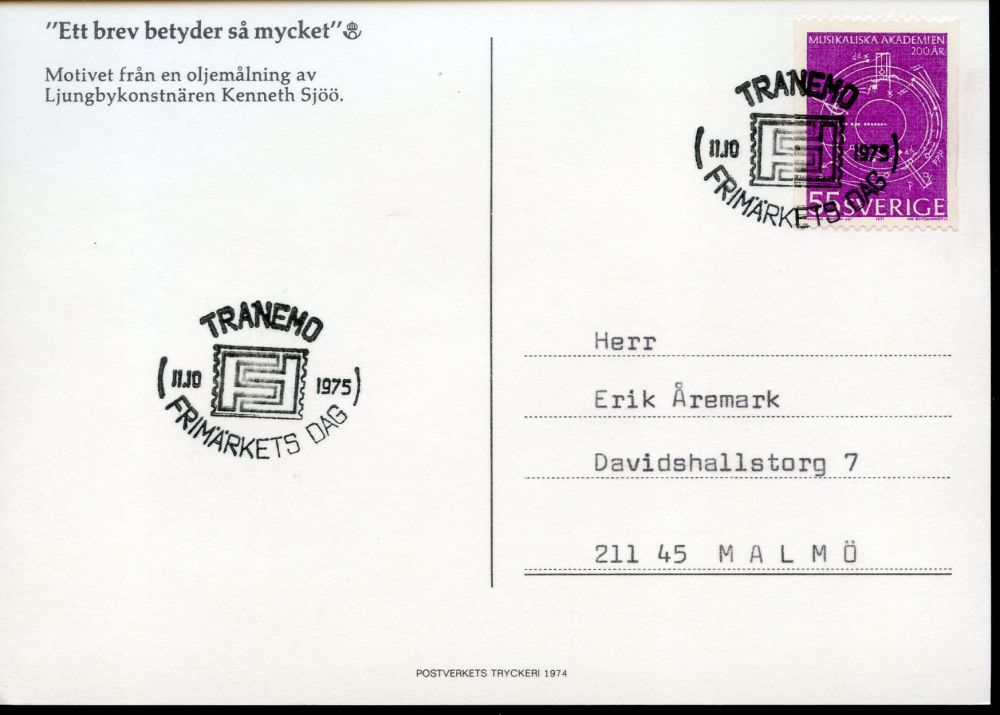 TRANEMO 11.10.1975. Frimärkets Dag. Frimärksfrämjandets logotyp |