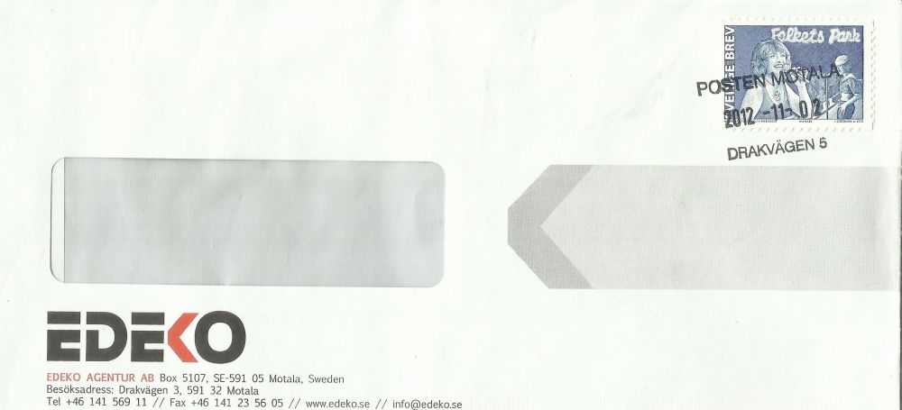 Motala, fyrkantstämpel på Folets Park på brev 2012 |
