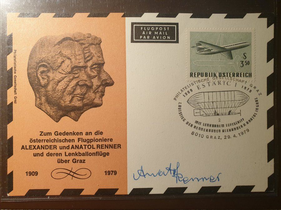 1909 Genomförde flygpionjärerna Alexander och Anatol Renner en ballongflygning över Graz. 70 år senare gavs detta minneskort ut. Det har autograf av Anatol Renner.Jag skickar med faktura. Betalning till bankkonto eller med swish inom 7 dagar från fakturadatum.
