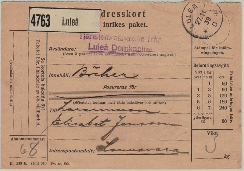Stämplar: Norrbotten | Brev o dokument: Försändelser 1938-1970 |