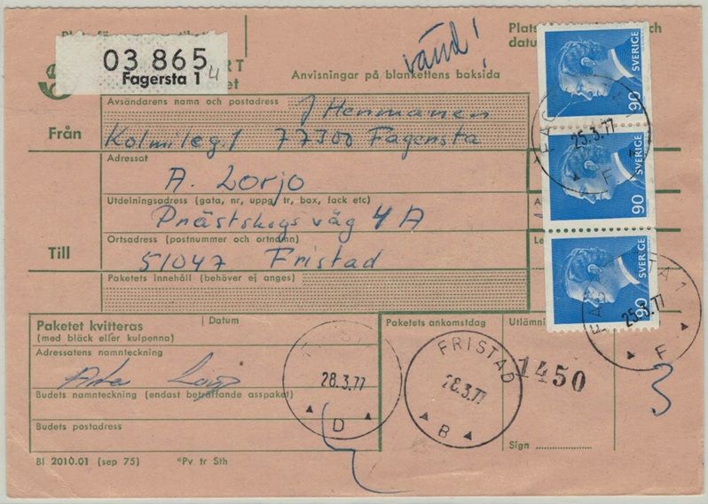 Fagersta 1 NSt 60 F på paketavi 25.3.77 |