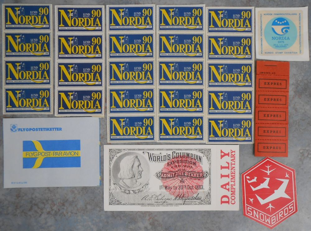 Klistermärken Nordia 90, häfte flygpostetiketter mm |