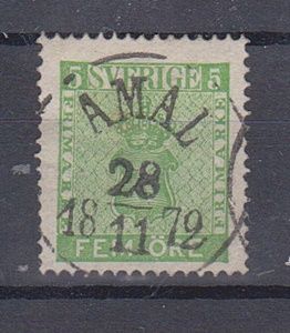 F7 5 öre vapentyp stpl. Prakt.Åmål 28-11-1872 snyggt märke Kv.190:-
