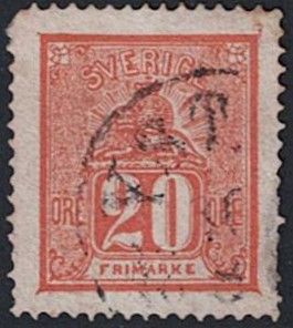 F 16 Liggande lejon, 20 öre röd, stpl YST(AD), snedcentr, ktt, luckfyllare					 |  |