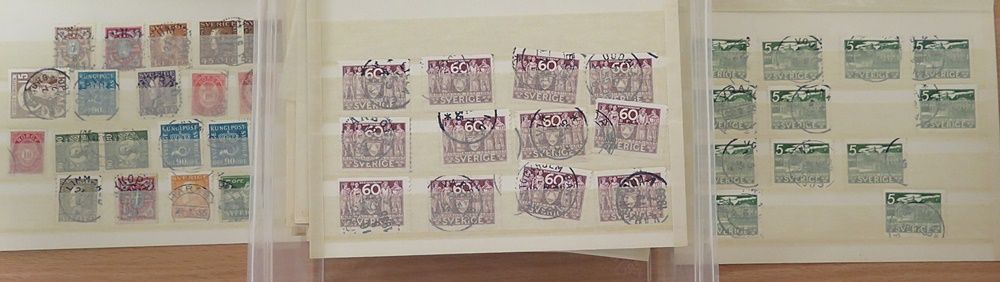 Sverige ostpl/ ortsstpl. svenska frim.i plastlåda. På ca 60 st A5 instickskort |
