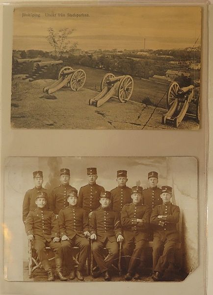 Vykort 2 st, Vy stadsparken Jpg och beväringar Axvalla stpl. 1911