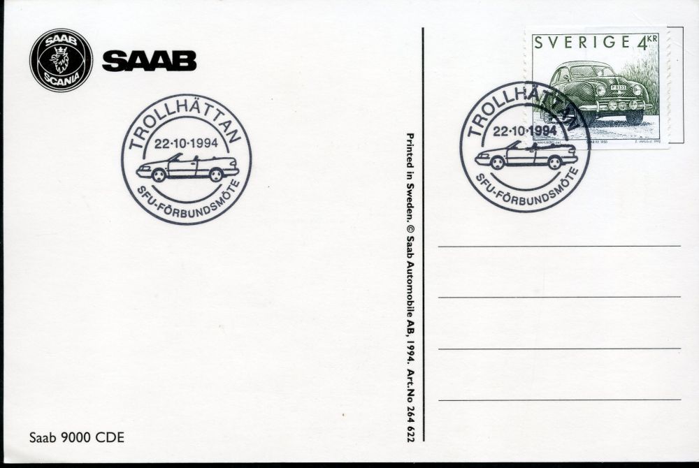 TROLLHÄTTAN 22.10.1994. SFU-Förbundsmöte. SAAB 900 Cabriolet.På vykort med SAAB 9000 CDE |