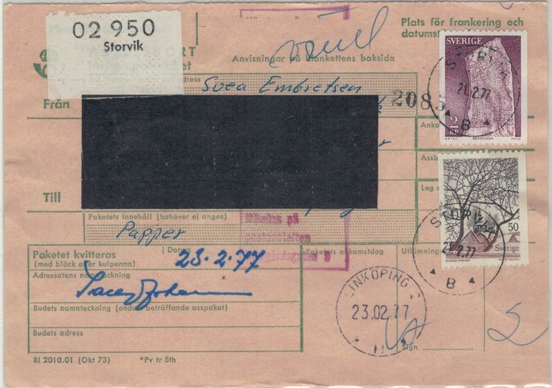 Storvik NSt 60 B på paketavi 21.2.77 (Häftesblock baksidan) |