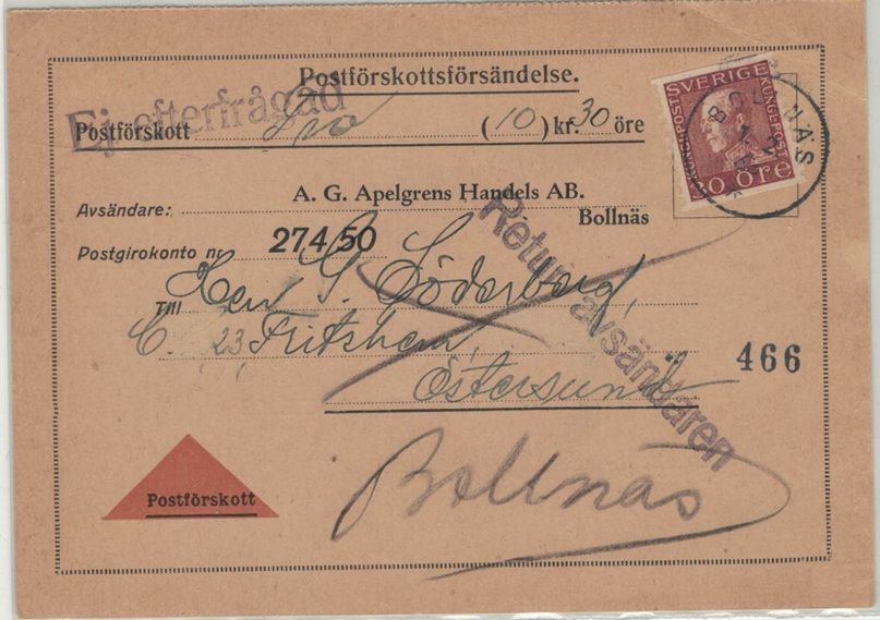 Bollnäs NSt 59b på postförskotts-brevkort 1.2.32 |