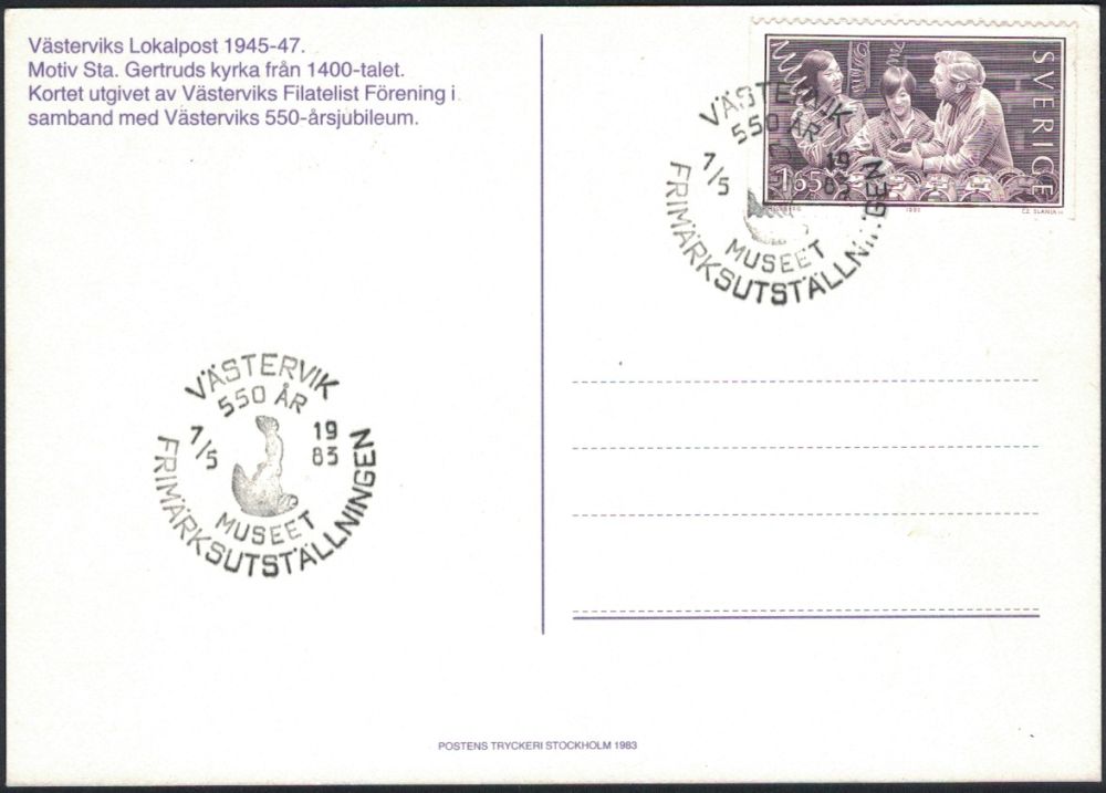 Minnesstämpel VÄSTERVIK 550 ÅR på PT-kort 1983 V-viks lokalpost 4 öre |
