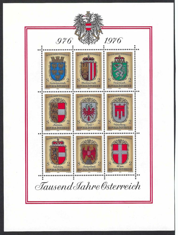 Miniblock (9 märken) postfriska. Samtliga delstaters vapen på märkena.