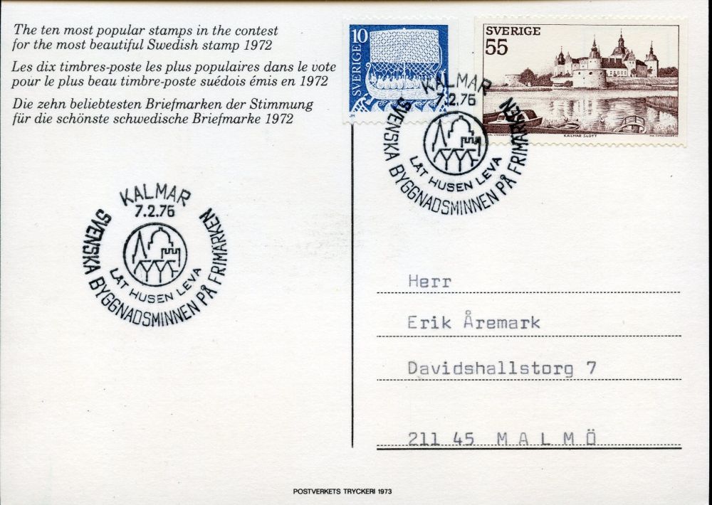 KALMAR 7.2.1976. Svenska Byggnadsminnen på Frimärken. Låt husen leva. |