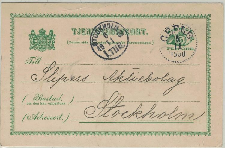 Gefle NSt 14 på tjänste-brevkort 5.11.1900 |