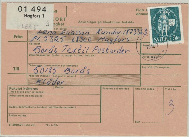Hagfors LBB 5 (Bergsäng) NSt 60 på paketavi 25.11.77 |