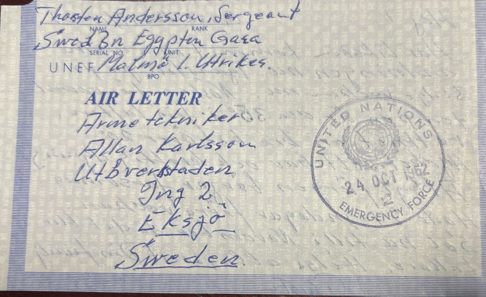 Ovanligt aerogram från FN i Egypten