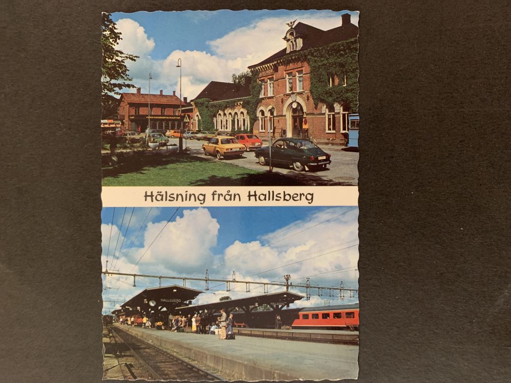 Hälsning från Hallsberg - Gamla bilar vid stationen |