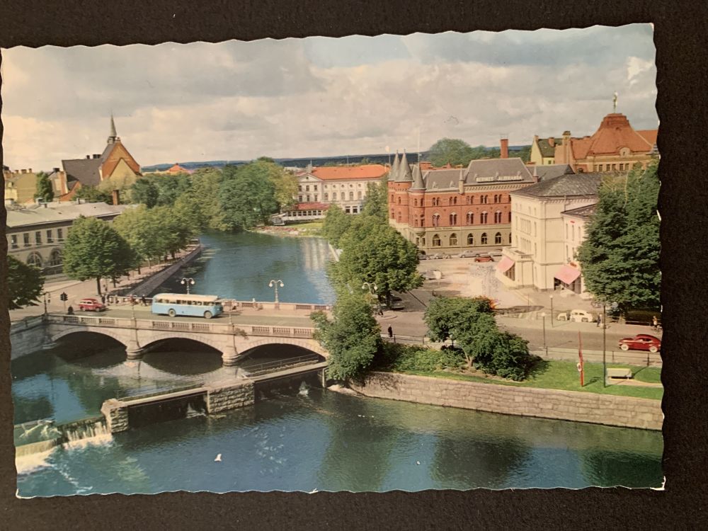 Äldre vykort - En gammal buss på storbron i Örebro |