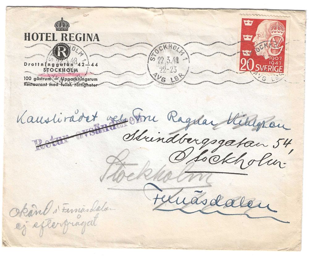 Reklambrev, Hotel Regina, Stokholm 1 22.3.48 |