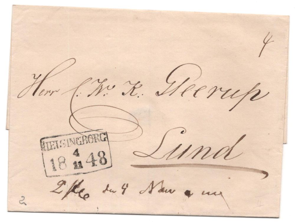 Brev till Lund med fyrkantstpl HELSINGBORG 1848-11-04