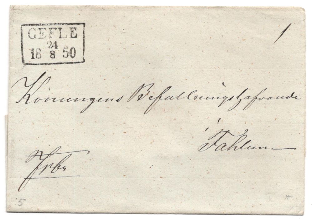Fribrev till Falun med fyrkantstpl GEFLE 1850-09-24 Lacksigill