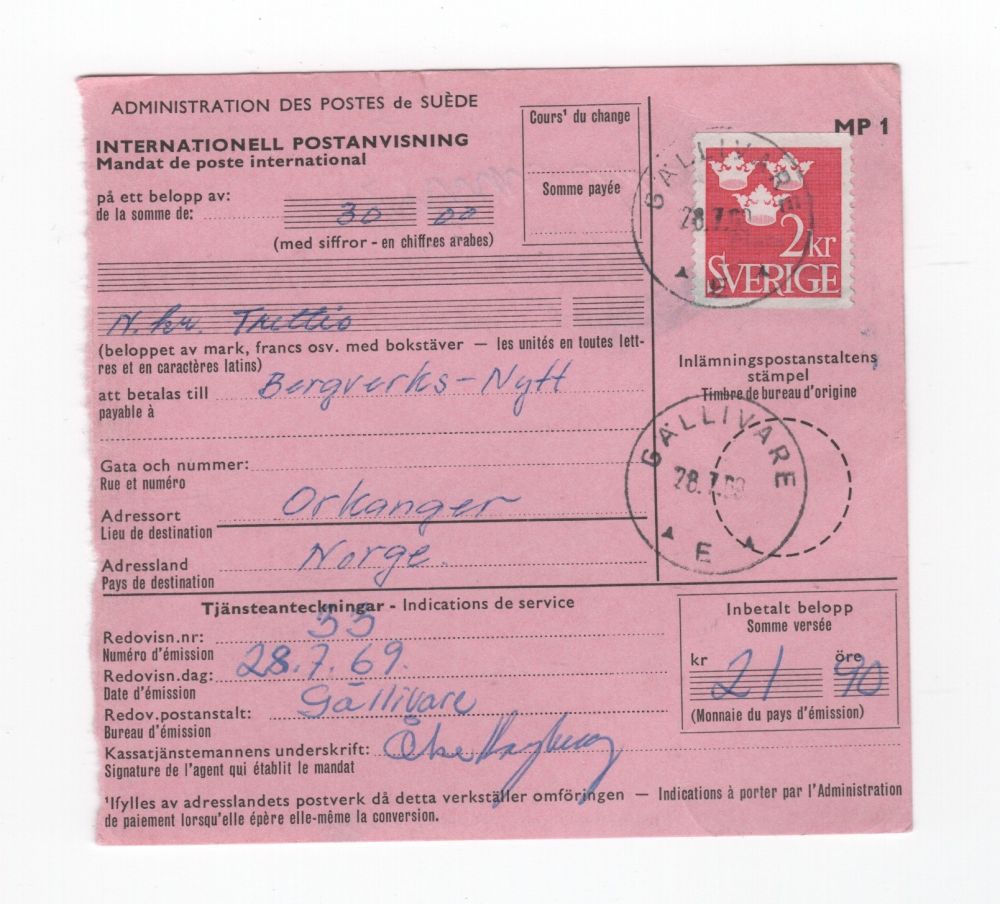 F309 Gällivare 1969-07-28 Postanvisning BD-län |