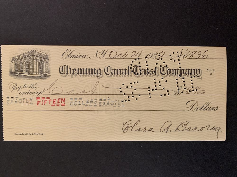 InfoDetta är en check från Chemung Canal Trust Company, daterad 24 oktober 1932. Checken är utställd på femton dollar och har serienummer 836.