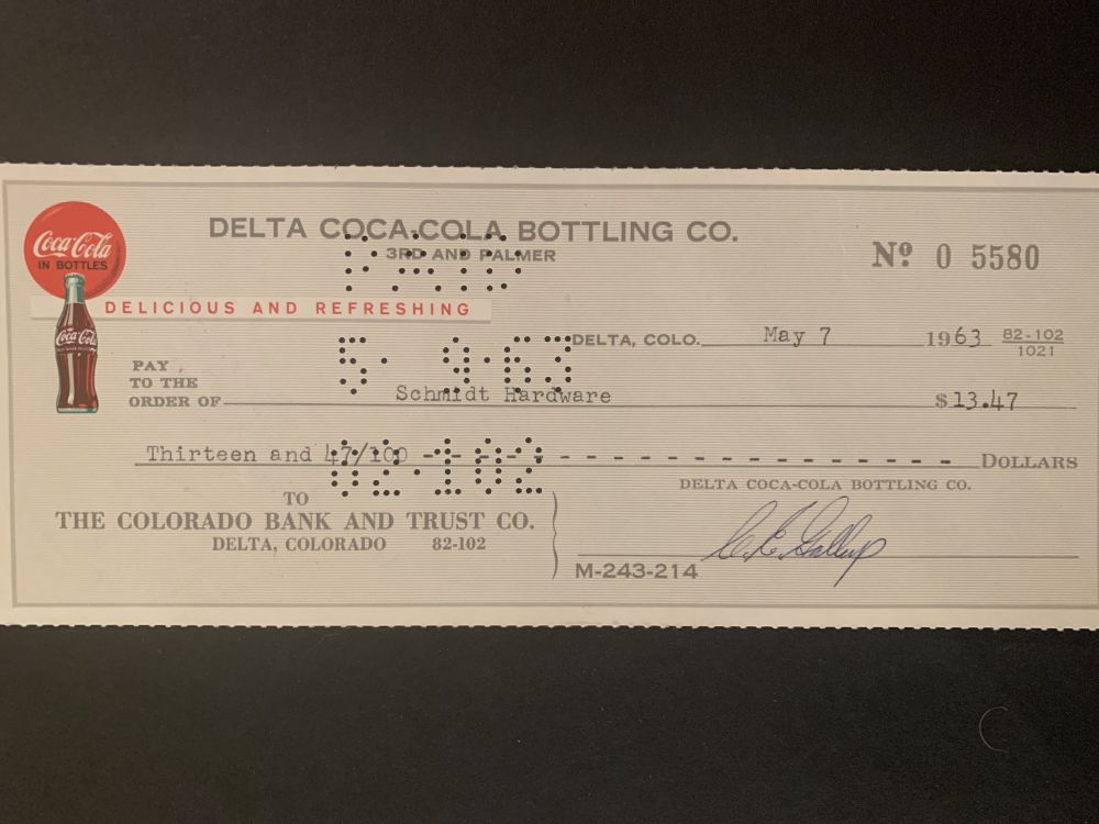 InfoDetta är en vintage check från Delta Coca-Cola Bottling Co. utfärdad den 7 maj 1963 till Schmidt Hardware. Beloppet är 13.47 dollar. Checken är numrerad 0 5580.