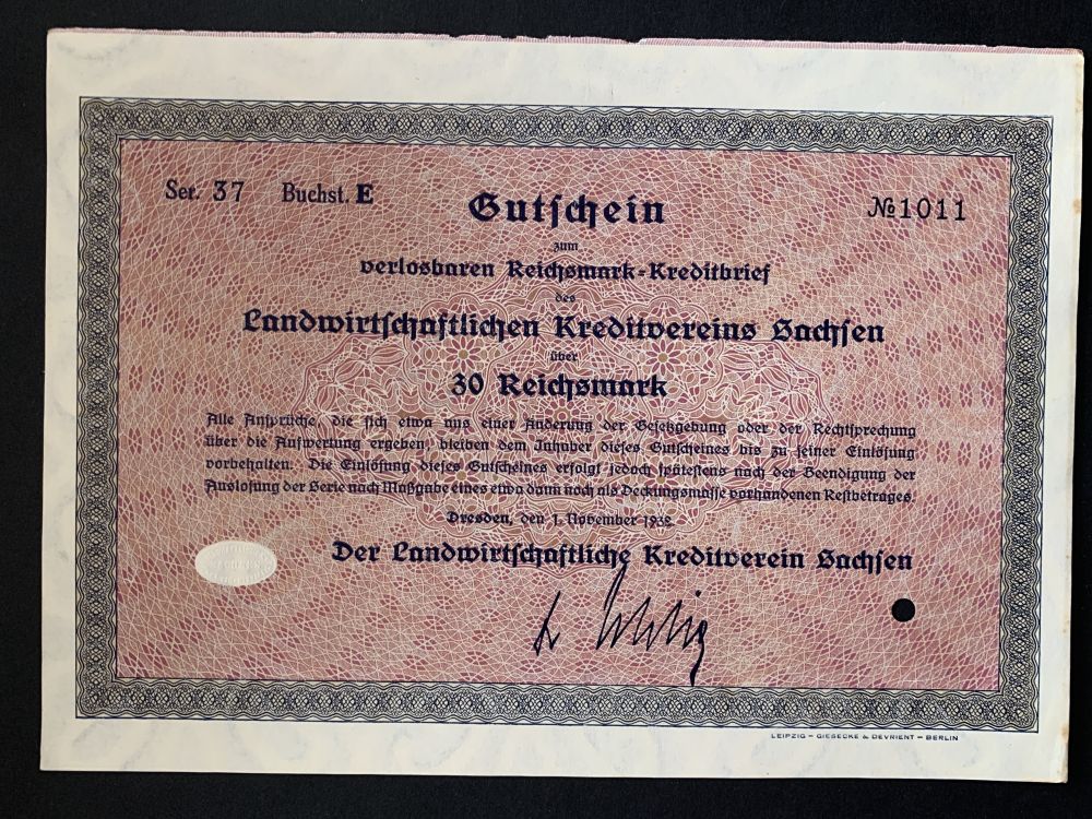 InfoGutschein från Landwirtschaftlichen Kreditvereins Sachsen. Utfärdad den 1 november 1932. Värdet är 30 Reichsmark. Serienummer är N°1011.