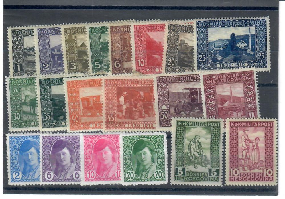 Bosnien-Hercegovina ockuperades av Österrike-Ungern 1878-1918. I Michel finns dessa märken under Österrike.Dessa märken finns med: Mi 29-42, 85-87 och 97-98. Samtliga märken med gummering men rest av fastsättare. Pris i Michel för ** märken är ca 40 euro.