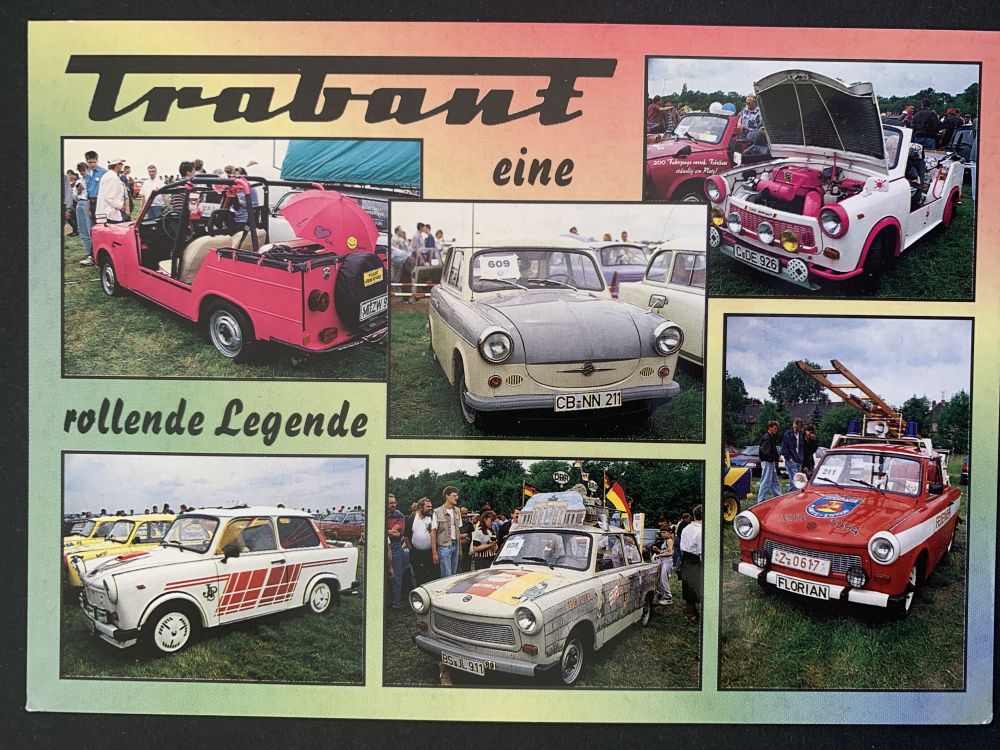 InfoBilderna visar olika modeller och anpassningar av Trabant, inklusive en röd cabriolet, en beige sedan, en vit sedan med röd grafik, en grå sedan med takräcke och flaggor, en röd brandbil och en vit cabriolet med öppen motorhuv.