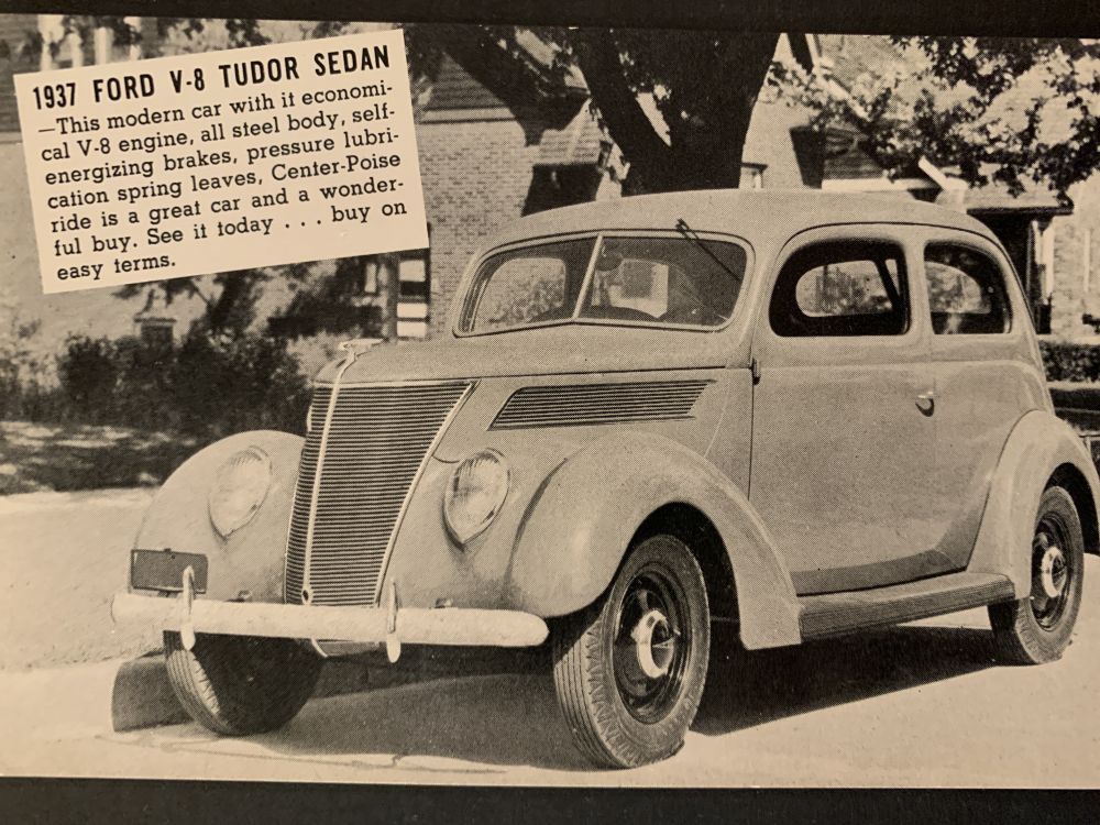 Infovisar bilen med text som beskriver dess ekonomiska V-8-motor, kaross i stål, självjusterande bromsar, trycksmörjning och Center-Poise-fjädring.
