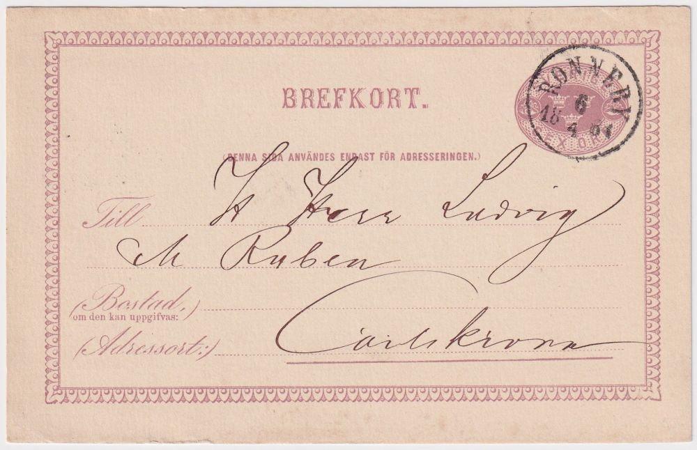 Brevkort stpl Ronneby 1881.4.6 K-Län |