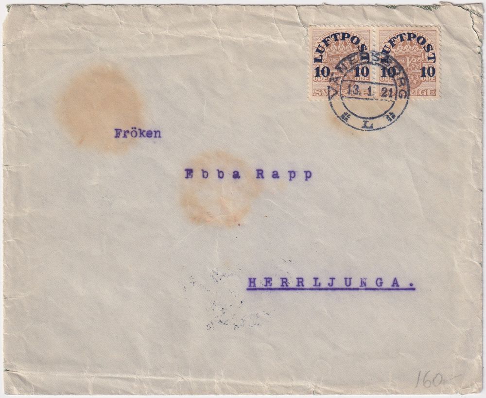 F136x2 par Luftpost brev stpl Vänersborg 1921.1.13 |