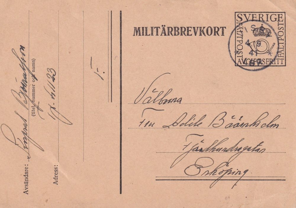 Militärbrevkort. VISBY till Enköping 4/9 -41 |