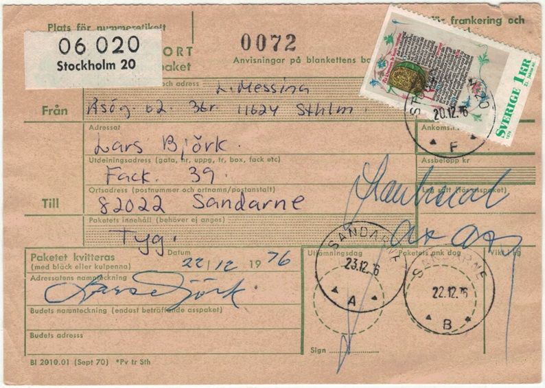 Stockholm 20 NSt 60 F på paketavi 20.12.76 (Häftesblock baksidan) |