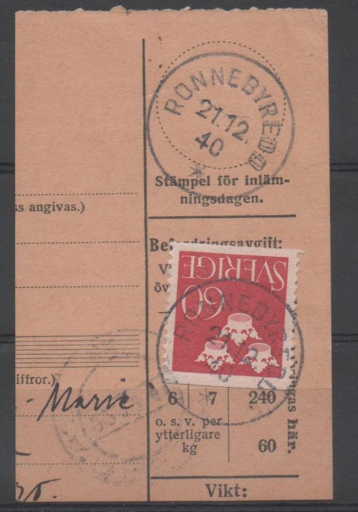 Postklipp med F286 60 öre röd avstämplat RONNEBYREDD 21.12.40.Bra skick.