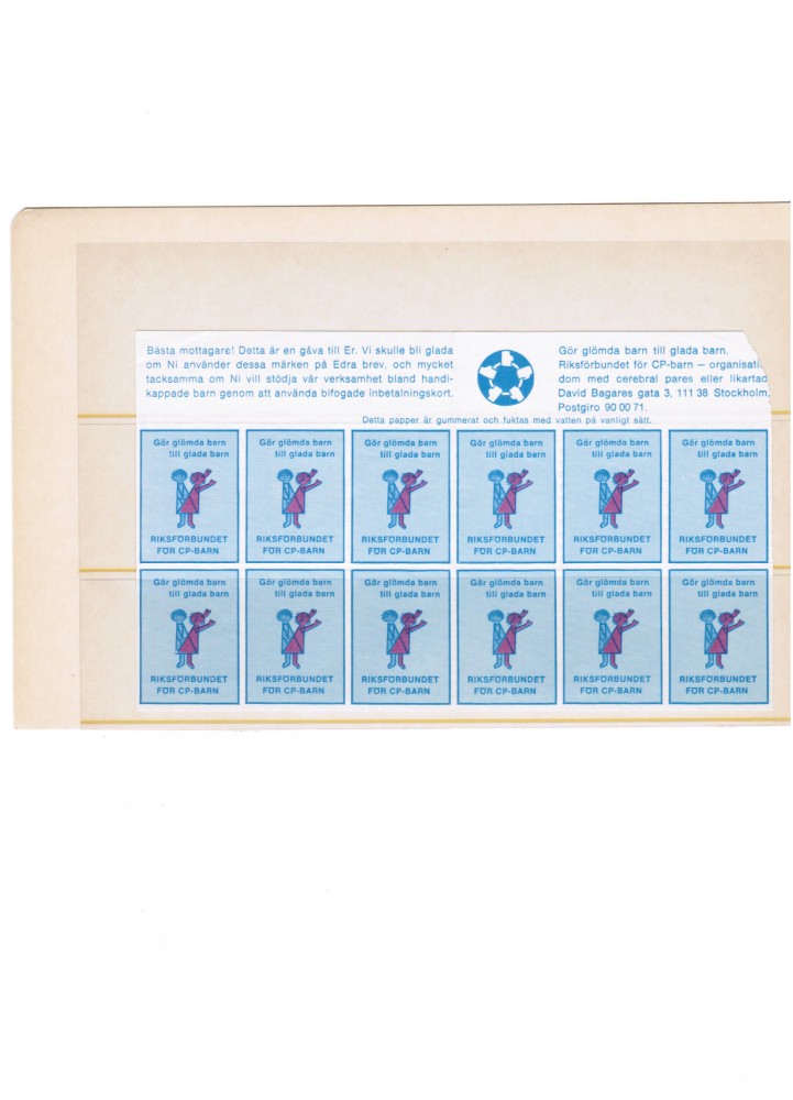 Utgivet av Riksförbundet för CP-barn under devisen "Gör glömda barn till glada barn"Porto och exp.kostnad min. 18 kr