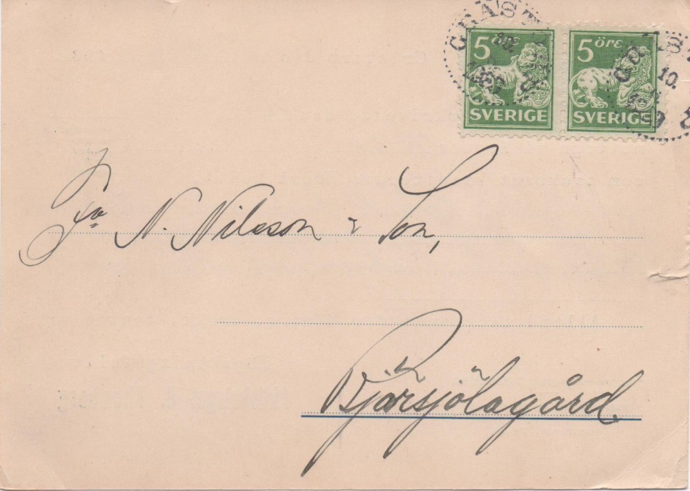 Brevkort avsänt den 10.6.1933 från AB B Thunberg i Grästorp.Frankerat med 2 st F143C, Lejon 4-sidigt par.