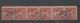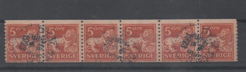 Stämplat 6-strip av F142Aa 5 öre Stående lejon, brunröd.Stämpel PLK 203 C är otydlig, men läsbar. Datumstämpel OK.