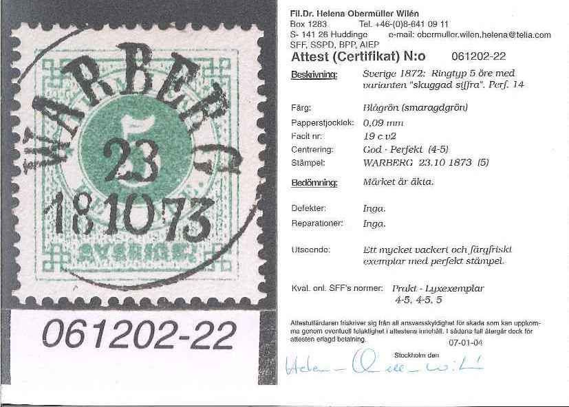 19c Warberg. Ringtyp tandning 14. 5 öre i PRAKT. HOW 4,4,5. N-län |