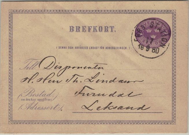 Fors station NSt 16 på brevkort 17.9.1880 |