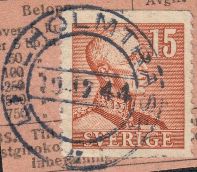 15 öre Gustaf V profil höger LILLHOLMTRÄSK 1944-12-19 något dubbelslagen stämpel (Nst 58p)Porto tillkommer med 22 kr.