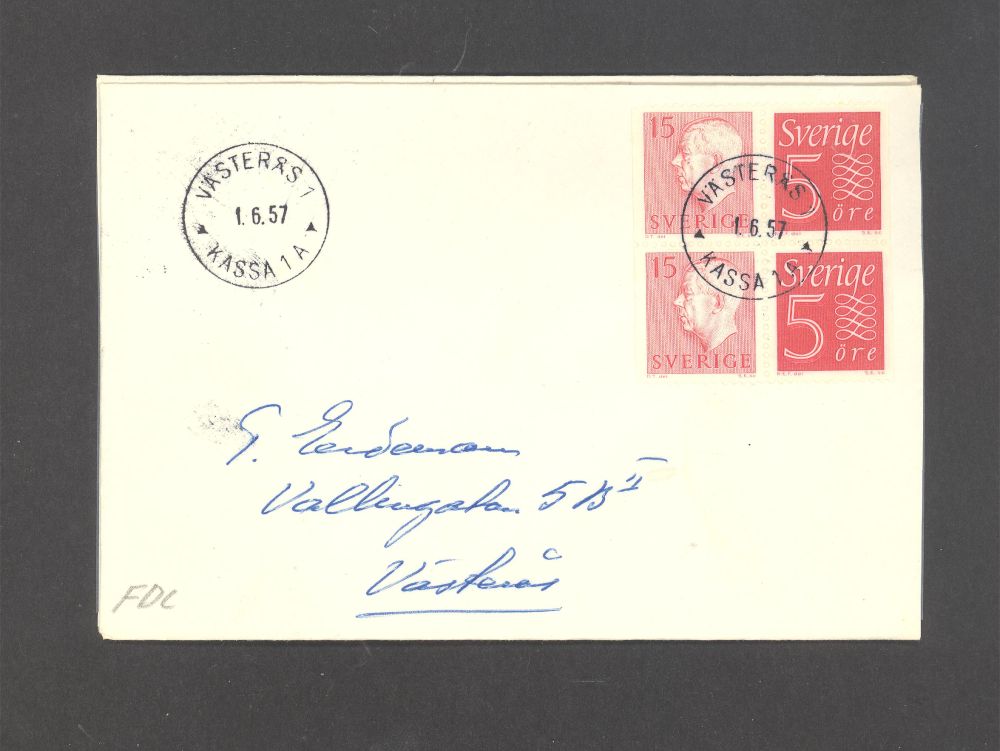 F 413sx1 G VI 4-block Förstadagsstämplat Västerås 1/6-57 |